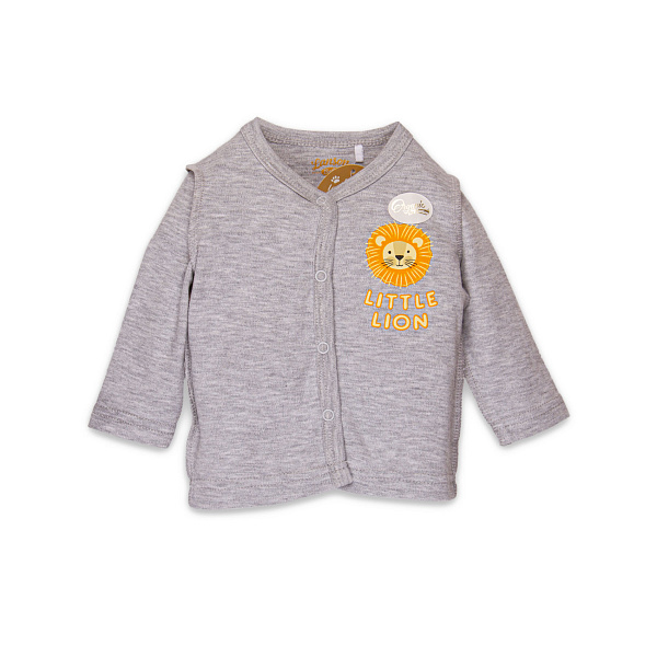 Детская кофта из тонкого трикотажа в сером меланжевом цвете. Боковые швы выполнены по наружной стороне кофты, чтобы предотвратить возможное натирание нежной детской кожи. Внешние края полочек и линия горловины оформлены с использованием косой бейки из такого же серого трикотажа, что и основное изделие. В качестве застежки использованы кнопки. Декор выполнен при помощи печати рисунка на ткань, который представляет собой надпись «Маленький лев» и рисунок забавной мордочки льва. В составе трикотажного полотна только высококачественный натуральный хлопок, без синтетических добавок.