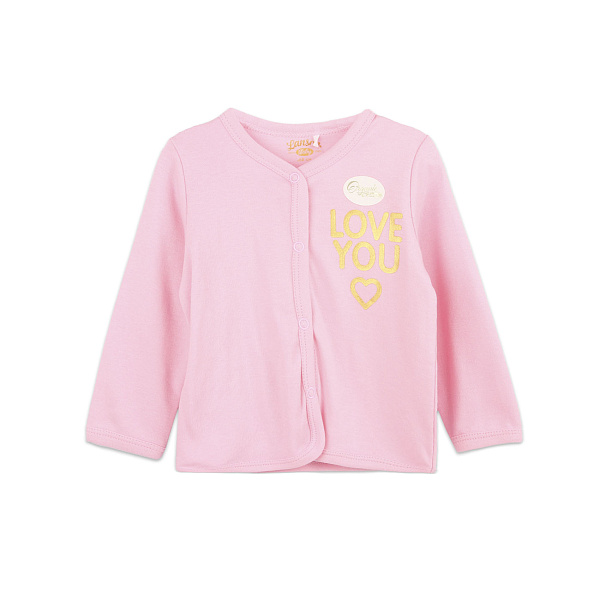Свободная трикотажная кофта пошита из мягкой и приятной на ощупь ткани. Материал на основе натурального хлопка приятно прилегает к телу, хорошо пропускает воздух и бережно сохраняет тепло внутри, поэтому пойдет в качестве первого слоя. Низ кофты и рукава свободные, не сковывают движения и дарят комфорт в носке. Дизайн кофты лаконичный, розовая ткань декорирована позолоченной надписью «Люблю тебя». Завершает дизайн застежка с кнопками. Рекомендовано для детей ясельного возраста.