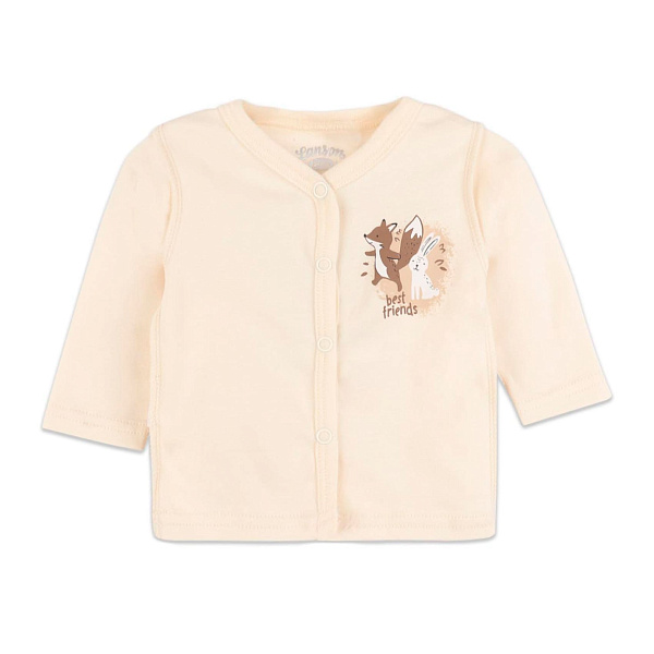 Трикотажная кофта с длинными рукавами для мальчика пригодится и для дома, и для прогулок в коляске. На груди кофта украшена забавным принтом с изображением двух лучших друзей: зайчонка и лисенка. Кофта сшита из натурального хлопкового материала (в составе хлопок 100%), мягкого и приятного на ощупь.