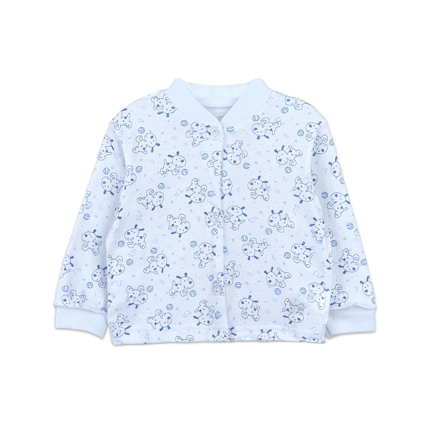 Хлопковая кофта на пуговицах предназначена для малышей ясельного возраста. Мягкая и приятая на ощупь хлопковая ткань хорошо пропускает воздух, обеспечивая тепло, сухость и комфорт в процессе носки. Свободный крой не сковывает движения, а длинные рукава с эластичными манжетами защитят ручки от холодного воздуха. Вырез горловины дополнен небольшим воротником. Застежка из пуговиц упростит переодевание малыша и снизит риск раздражения и дискомфорта. Ткань кофты украшена принтом с щенками синего и голубого цветов. Рекомендовано для детей ясельного возраста.