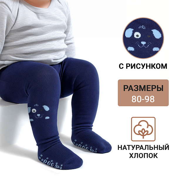 Колготки имеют глубокий синий цвет. На них изображен милый щенок. Это теплая модель для холодного времени года. На подошвах расположены прорезиненные рисунки. Они помогают избежать скольжения на гладком полу. Плотное трикотажное полотно хорошо сохраняет тепло. Мягкая резинка на поясе не перетягивает живот.