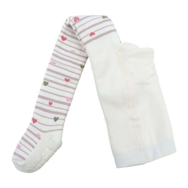 Колготки имеют белый цвет. Они украшены розовыми и зелеными полосками. Сердечки в розовом и зеленом оттенках размещены по всей длине. На подошвах нанесен узор из точек. Этот узор предотвращает скольжение на гладких поверхностях. Колготки подходят для повседневной носки.