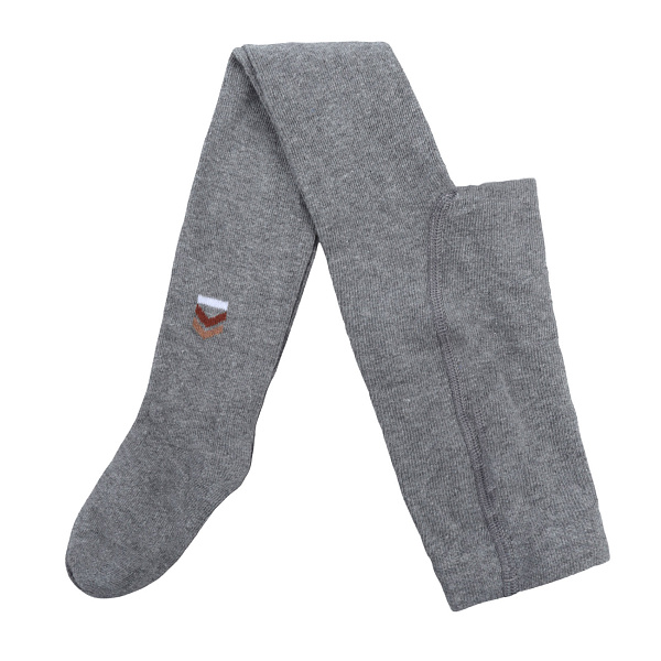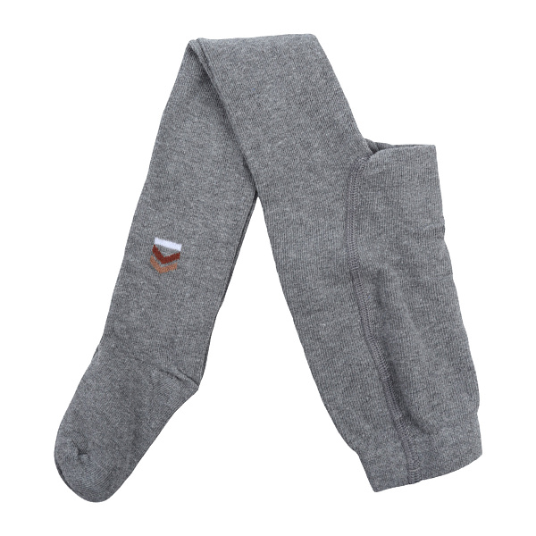 Колготки выполнены в сером цвете. Они гладкие на ощупь и имеют простую форму. На одной ноге размещен небольшой узор в виде треугольника с белым и оранжевым элементами. Колготки легко надеваются и снимаются благодаря эластичности. Колготки подходят для повседневного использования.