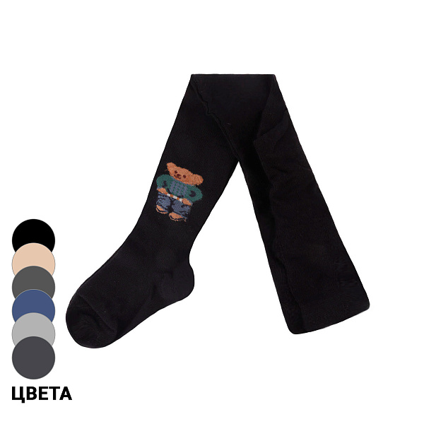 Колготки для мальчиков на каждый день из хлопчатобумажного (ХБ) материала. Модель в черном цвете с рисунком медведя на боку. Оттенок немаркий, хорошо скрывающий любые загрязнения. Он идеально подходит для малышей, которые часто пачкаются. Ткань на основе хлопка с добавлением синтетики и эластана. Изделие легко тянется и комфортно сидит. В пояс вшита удобная и мягкая резинка, которая не давит на живот.