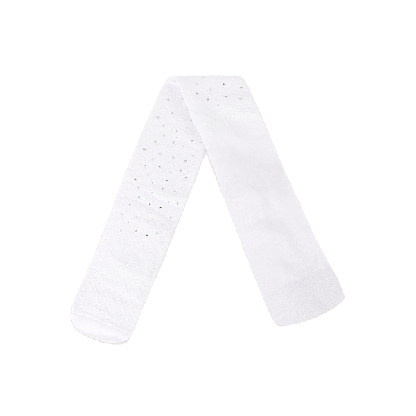 Нарядные колготки для девочек с эластаном в составе. Изделие белого цвета с рельефным узором украшенным, серебряными стразами. Модель выглядит красиво и празднично. Это идеальный вариант для торжественных мероприятий и утренников в холодное время года.