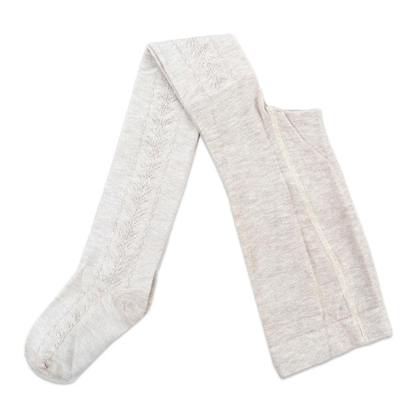Колготки имеют нежный бежевый оттенок. На них нанесен фактурный растительный орнамент. Такое плетение придает трикотажу дополнительную эластичность. Изделие хорошо тянется и плотно облегает ногу. Мягкая резинка на поясе аккуратно держит колготки.