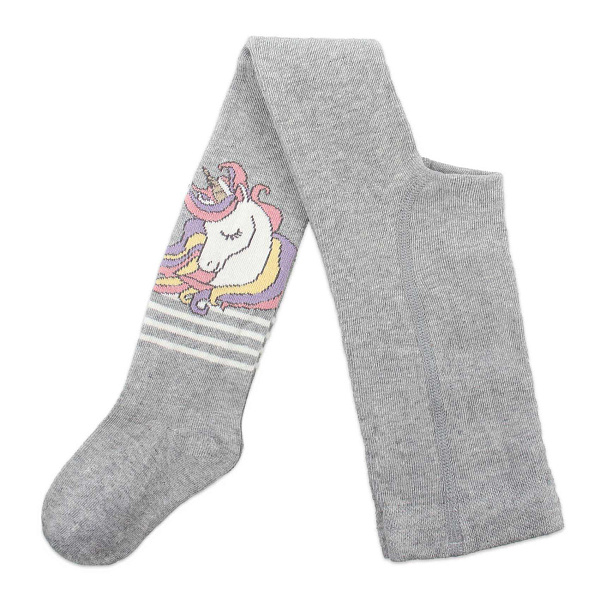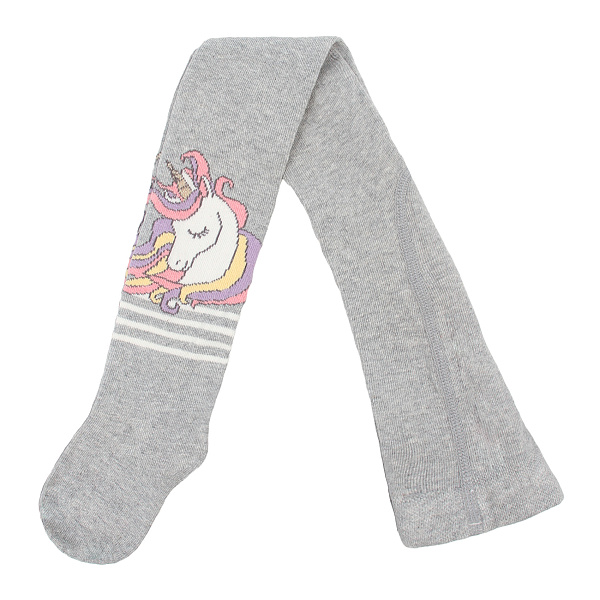 Серые колготки для девочки с белыми полосками и изображением сказочного единорога станут хорошим дополнением в гардеробе маленькой принцессы. Универсальный оттенок сочетается с повседневной и праздничной одеждой. Легкая и ровная фактура материала придает изделию аккуратный внешний вид и обеспечивает комфортное прилегание без сдавливания ножек.