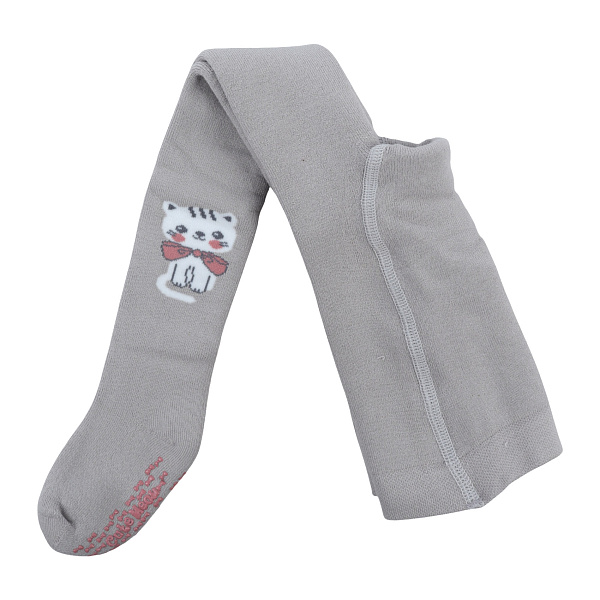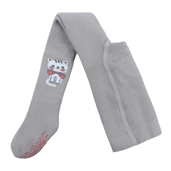 Теплые колготки для девочки имеют серый цвет. На ноге изображен милый котенок с бантиком. Подошва покрыта противоскользящим рисунком в виде точек. Колготки подходят для холодной погоды.
