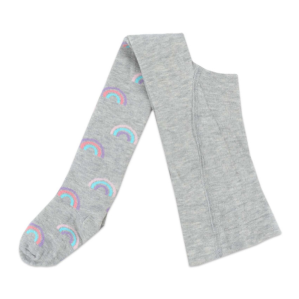 Колготки имеют серый цвет. На них нанесен яркий принт с разноцветной радугой. Модель создана для повседневной носки. Плотность трикотажа подходит для прохладных дней. Резинка на поясе мягко фиксирует изделие. Веселый рисунок поднимает настроение.