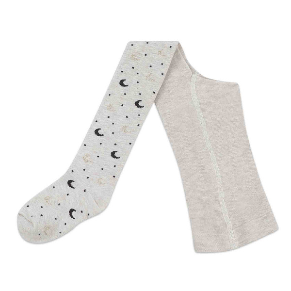 Колготки для девочек выполнены из хлопка, что обеспечивает отличную мягкость, комфорт и хорошую воздухопроницаемость. Модель имеет бежевый цвет и украшена оригинальным принтом из черных и золотистых лун, а также мелких черных точек. Такой дизайн придает колготкам стильный и современный внешний вид, подходящий как для повседневной носки, так и для создания ярких образов. Удобная эластичная посадка обеспечивает плотное прилегание без ощущения сдавливания.
