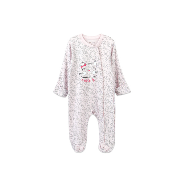 Нежный девичий комбинезон станет чудесным вариантом для прогулки или уютных домашних вечеров. Ткань из натурального хлопка бережно сохраняет тепло мягко прилегает к телу. Ступня закрытая и дополнена бантиками, поэтому ножки ребенка будут в тепле и сухости. Рукава длинные с антицарапками уберегут малыша от травмирования. Вырез горловины круглый, без воротника. Застежка с кнопками длиной от горловины до стопы позволит родителям быстро переодеть ребенка и сменить подгузник. Дизайн завершает рисунок кошечки с бантом и надписью розового цвета. Рекомендовано для детей ясельного возраста.