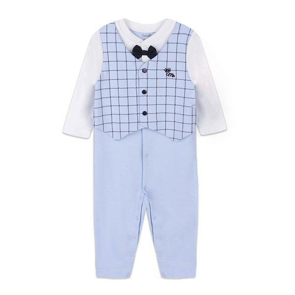 Очаровательный комбинезон с закрытыми ножками и длинным рукавом идеально подойдет для маленьких модников. Выполнен из мягкого и приятного на ощупь хлопка. Ткань хорошо пропускает воздух и позволяет коже дышать, не вызывает раздражения кожи. Изделие обеспечит комфорт и уют малышу в течение всего дня. Голубой и белый цвет в сочетании с жилетом в клетку и милой темно-синей бабочкой, комбинезон выглядит стильно и элегантно.