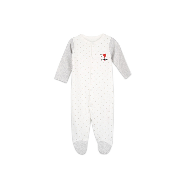Детский комбинезон привлекает внимание лаконичным дизайном. В основе материала использован натуральный хлопок, он мягок и приятен на ощупь, обеспечивает естественную вентиляцию и дарит комфорт. Пятка комбинезона закрытая и выкрашена в светло-серый цвет, который органично сочетается с основным полотном белого цвета с мелкими звездочками. Рукава длинные, в тон к ступне. По центру имеются застежки для комфортного одевания, грудная часть украшена принтом с надписью «Я люблю маму». Вырез горловины круглый, воротника нет. Рекомендовано для детей ясельного возраста.