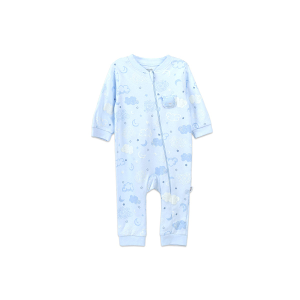 Детский комбинезон привлекает внимание нежным дизайном: ткань нежного голубого цвета украшена принтами с облаками и луной. В основе материала использован натуральный хлопок, он мягок и приятен на ощупь, обеспечивает естественную вентиляцию и дарит комфорт. Пятка комбинезона открытая, низ штанин дополнен мягкими манжетами. Рукава длинные с такими же манжетами. По центру имеется косая молния для комфортного надевания, грудная часть украшена мягкой медвежьей мордочкой. Вырез горловины круглый. Рекомендовано для детей ясельного возраста.
