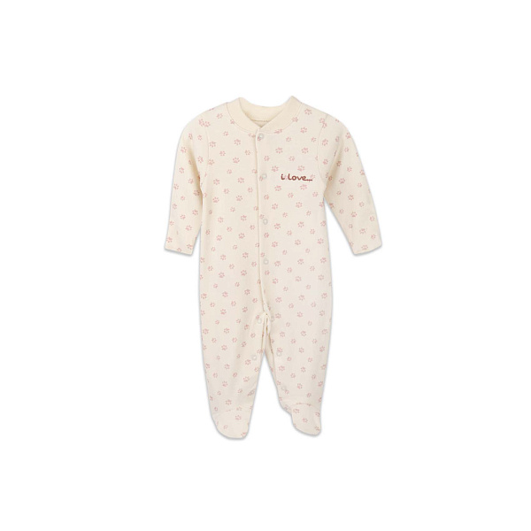 Удобный комбинезон предназначен для маленькой девочки. Модель разработана с учетом потребностей ребенка, имеет ступню и застежку на груди. Кнопки плавно переходят в соединительные швы на штанинах. Такая схема упрощает замену подгузника, ускоряет процесс переодевания. Изделие оформлено в нежной цветовой гамме, украшено смешным рисунком в нижней части спинки.