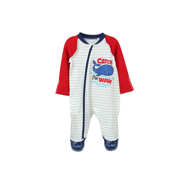 Стильный комбинезон в морском стиле порадует каждого любителя морских приключений. В основе мягкой и приятной на ощупь ткани использован натуральный хлопок, который хорошо пропускает воздух, но при этом сохраняет тепло. Стопа комбинезона закрытая, носочки выполнены в синем цвете и дополнены рисунком кита. Свободный крой изделия не сковывает движения, а наружные швы (до 68 размера) не натирают нежную детскую кожу. Косая застежка-молния от горловины до пятки позволит быстро переодеть малыша или сменить подгузник. Рукава длинные, выкрашены в контрастный красный цвет, который органично сочетается с синим и бежевым. Завершает образ принт кита с надписью «Лови волну». Рекомендовано для детей ясельного возраста.