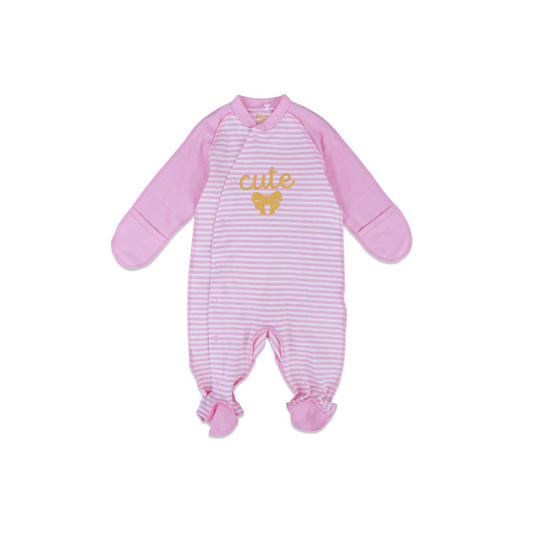 Симпатичный комбинезончик выпущен для девочек ясельного возраста. На груди золотистая надпись cute (милый) и того же цвета узор. Розовый в белую полоску комбинезон изготовлен на 100% из хлопка, он гигиеничен, мягок, не раздражает кожу младенца. В такой одежде ребенку комфортно и тепло. У комбинезона закрытые ступни, застегивается он кнопками-пуговицами, что позволяет родителям быстро и легко одеть ребенка. В таком комбинезоне малыш может спать, играть, учиться ходить. Ткань хорошо отстирывается. Эта одежда допускает использование подгузника без какого-либо дискомфорта для младенца.