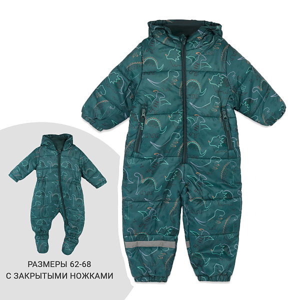Демисезонный комбинезон с динозаврами — идеальный выбор для межсезонья. Темно-зеленый цвет с ярким принтом динозавров привлекает внимание и радует глаз. Верх и наполнитель изготовлены из 100% полиэстера, обеспечивающего ветро- и водонепроницаемость. Подкладка из смеси хлопка (65%) и полиэстера (35%) дарит дополнительное тепло и комфорт.