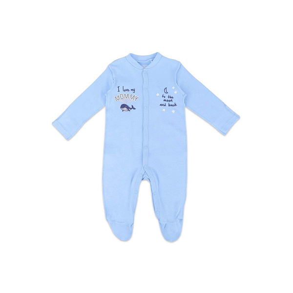 Современные комбинезоны для малышей тщательно продуманы, чтобы облегчить родительский быт и подарить комфорт малышу. Так, представленный комбинезон благодаря ряду застежек-кнопок, расположенных от горловины до самых ступней, раскрывается как кофта, чтобы ребенка можно было положить внутрь и закрыть одеждой! Такой подход крайне удобен. Прошитая ступня комбинезона предохраняет ножки от переохлаждения, а длинные рукава защищают плечи и ручки. Комбинезон выполнен в классическом голубом цвете и украшен рисунком темно-синего кита с надписью на английском «Люблю мамочку».