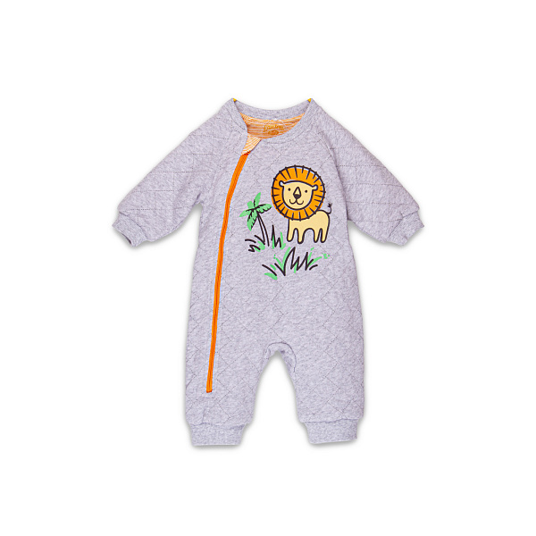 Мягкий двухслойный трикотажный комбинезон для малышей представляет собой утепленную модель для холодного времени года. Внутренний слой комбинезона выполнен из оранжевого трикотажа, внешний – из серого. Диагональная застежка оформлена косой бейкой оранжевого цвета, которая ярко контрастирует с серым внешним слоем. В зоне горловины дополнительно предусмотрен кармашек для изоляции замка от застежки типа «молния», чтобы обезопасить нежную кожу малыша от царапин. Комбинезон рассчитан на рост малыша 62 сантиметра. В качестве дополнительного декора использован принт на груди с рисунком льва и пальмами.