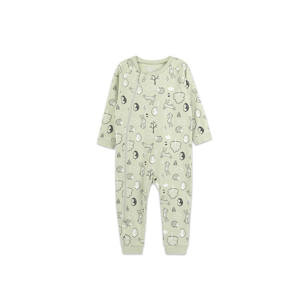 Комбинезон выполнен в светло-зеленом цвете с принтом в виде лесных зверьков по всей поверхности.