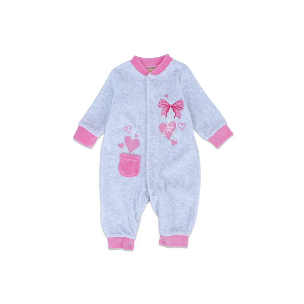 Комбинезон застегивается на кнопки от горловины до ног, что позволяет легко переодевать ребенка. Светло-серый спокойный цвет ткани с розовыми манжетами не перегружает глаза и чудесно вписывается в гардероб девочки. На передних полочках есть декоративный кармашек и рисунки бантиков и сердечек.