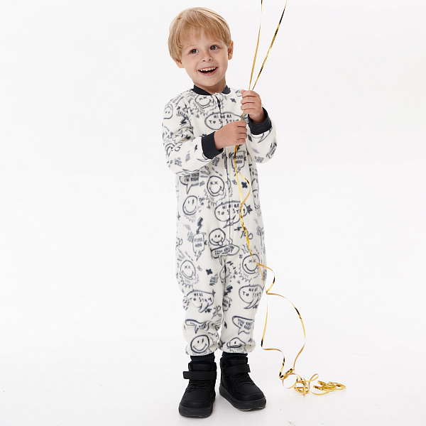 Белая основа комбинезона украшена смайликами, создающими веселое настроение. Удобный крой не сковывает движения ребенка, благодаря чему он сможет свободно играть и бегать без чувства стесненности или дискомфорта. Застежка-молния вдоль всего комбинезона облегчает процесс одевания и раздевания, что особенно важно для младших детей.