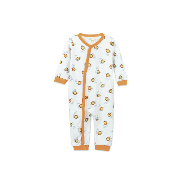 Мягкий хлопковый комбинезон согреет малыша, а красочный дизайн подарит маленькому соне сладкие сны. Натуральный хлопок в составе приятно прилегает к телу, хорошо пропускает воздух и дарит комфорт нежной коже. Ступни открытые, штанины дополнены оранжевыми манжетами, рукава удлиненные. Вырез горловины круглый, без воротника. Косая застежка с кнопками от горловины до ступни позволит родителям быстро переодеть ребенка и сменить подгузник. Дизайн комбинезона яркий и красочный, ткань украшена львиными мордочками с надписями. Рекомендовано для детей ясельного возраста.