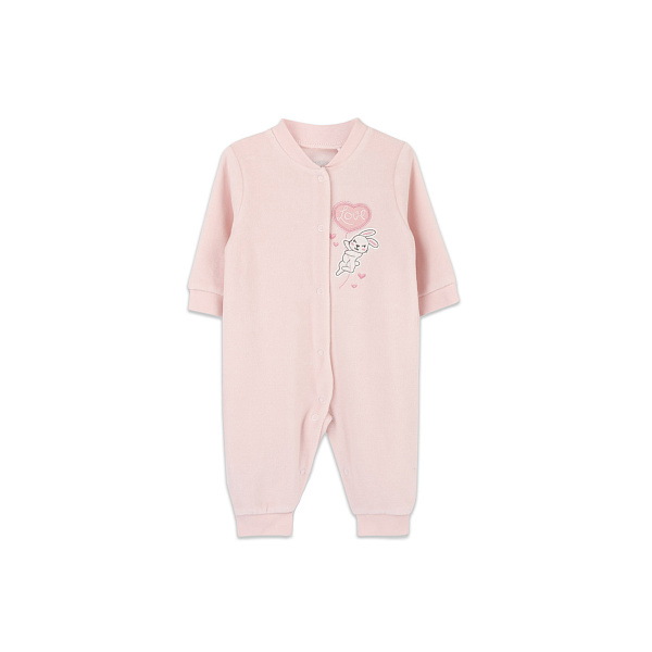 Согреть малышку в ненастную погоду поможет велюровый комбинезон. Нежный дизайн изделия не оставит без внимания взрослых и увлечет ребенка. Комбинезон выполнен в нежном розовом цвете с вышивкой в виде милого зайчика и россыпи сердечек.