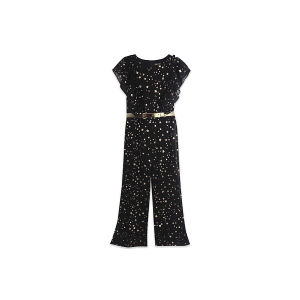 Комбинезон выполнен в тёмном синем цвете с принтом в виде ярких золотистых звёзд по всей поверхности ткани. Изделие дополнено тоненьким золотым ремешком. Застёгивается сзади на молнию.