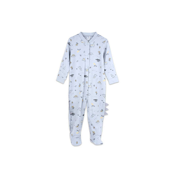 Практичным решением для мальчика ясельного возраста послужит слитный комбинезон с закрытыми ножками. Модель создана с учетом потребностей ребенка и его анатомических особенностей. Глубокая застежка в виде потайных кнопок упрощает переодевание, позволяет быстро заменить подгузник. Трикотажные манжеты и воротничок гарантируют плотное прилегание. В качестве декора использованы зубчики треугольной формы. Они вшиты в боковые швы, гармонично сочетаются с изображениями динозавров на ткани.