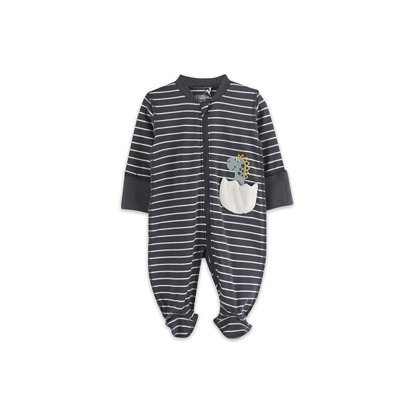 Материал темно серого цвета в белую полоску. Сбоку на лицевой стороне есть забавный рисунок динозавра, только что вылупившегося из яйца. Одежду можно носить дома, надевать на прогулки или в поездки. Плюс, что ее можно легко и быстро снять в случае непредвиденной ситуации.