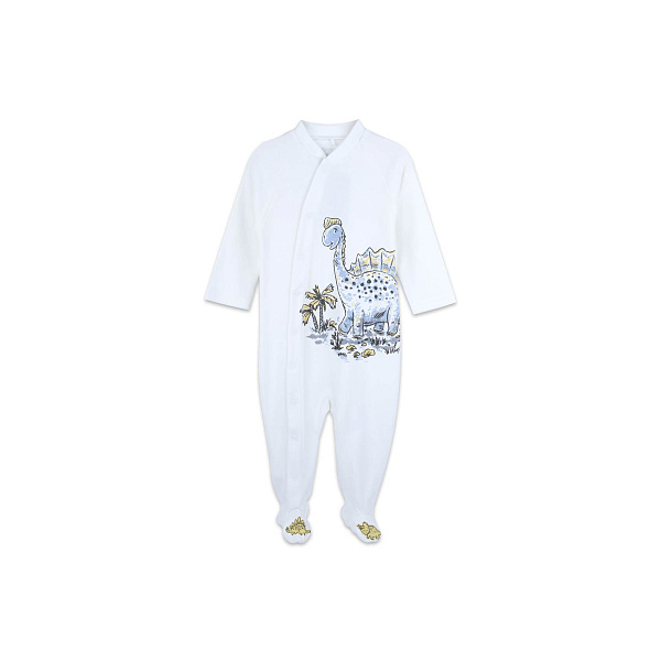 Нарядный комбинезон привлекает внимание оригинальным изображением динозавра и нежной цветовой гаммой. При разработке выкройки были учтены базовые потребности малыша и особенности его анатомии. Для самых маленьких размеров рукава дополнены открывающимися кармашками, защищающими ребенка от собственных острых ноготков. Удобная застежка в виде миниатюрных кнопок упрощает процедуру переодевания, позволяет оперативно заменить подгузник. Внешние соединительные швы исключают дискомфорт, не натирают кожу.