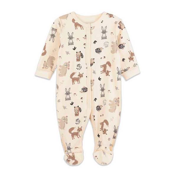 Удобный комбинезон с закрытой ступней станет любимым нарядом маленького мальчика и его мамы. Изделие будет бережно облегать тело ребенка, не сковывая его движений. Наружные соединительные швы (в маленьких размерах) не способны натирать кожу, вызывать раздражение. Застежка из миниатюрных кнопок позволит быстро заменить подгузник, упростит переодевание. Модель оформлена в приятной цветовой гамме, украшена изображениями милых и забавных лесных животных.