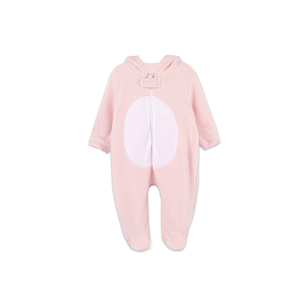 Утепленный флис-комбинезон для девочек. Комбинезон оснащен закрытой ступней с протекторами от скольжения для дополнительной безопасности. На животе имеется белая текстильная вставка, а капюшон с ушками выполнен в виде мордочки котика. Такой дизайн, имитирующий образ кота, поднимает малышу и взрослым настроение. Комбинезон застегивается на молнию.