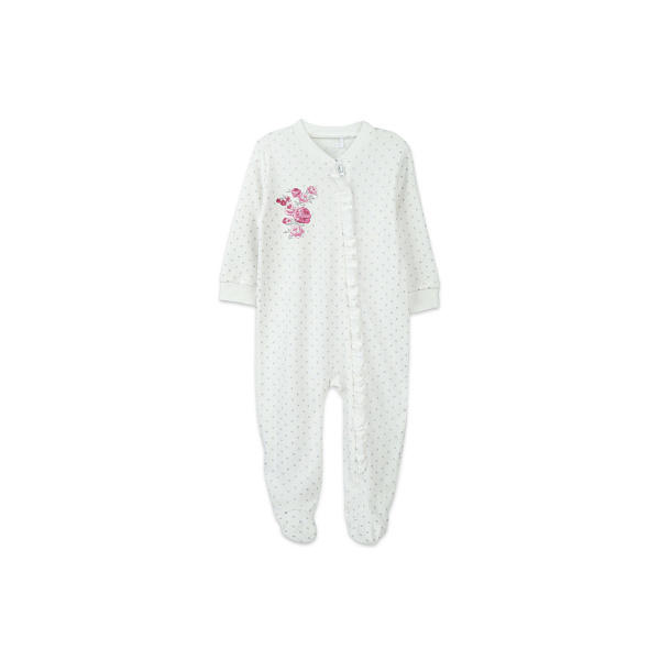 Трикотажный комбинезон согреет малышку в прохладные дни и подарит ей тепло, словно объятия мамы. Ступни комбинезона закрыты и дополнены эластичной резинкой, она плотно обхватывает ножку, не позволяя штанине сползать, но и не сдавливает кожу. Рукава длинные и дополнены манжетами, которые утеплят малышку. Вырез горловины круглый. В качестве застежки использована косая молния, она пролегает от ворота до низа одной из штанин, облегчая переодевание младенца. Дополнительно застежка декорирована рюшами – они добавляют нежности в образ. Завершает дизайн не менее нежный рисунок розочек спереди. Рекомендовано для детей ясельного возраста.