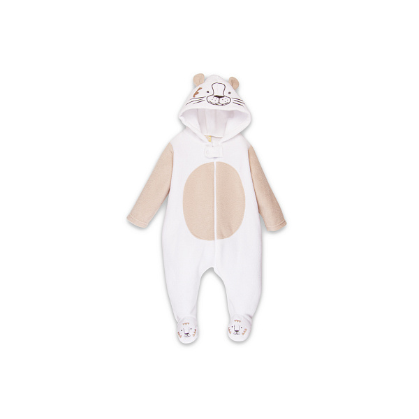 Забавный комбинезон для малышей из мягкого гипоаллергенного флиса и, благодаря оригинальному дизайну, подойдет для мальчиков и для девочек. Комбинезон выполнен в двух цветах: белом и бежевом. Диагональная застежка на молнию позволяет легко надеть комбинезон на малыша. Дополнительная планка с кнопкой защищает бегунок от расстегивания. Комбинезон закрытый снизу, а на передней части стопы выполнен рисунок мордочки тигра с помощью машинной строчки нитками разного цвета. Модель имеет капюшон с забавными нашитыми ушками и вышитой мордочкой тигра.