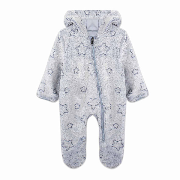 Серо-голубой комбинезон с рисунком звездочек выглядит мягким и пушистым. Капюшон защищает шею, уши и голову от ветра и холода. Застежка на молнии проходит спереди, от воротника до низа. Он не сковывает движения ребенка. Легко надевается и снимается благодаря молнии. Рукава заканчиваются отворачивающимися рукавицами, которые не дают холодному воздуху попадать внутрь. Ноги полностью закрыты.