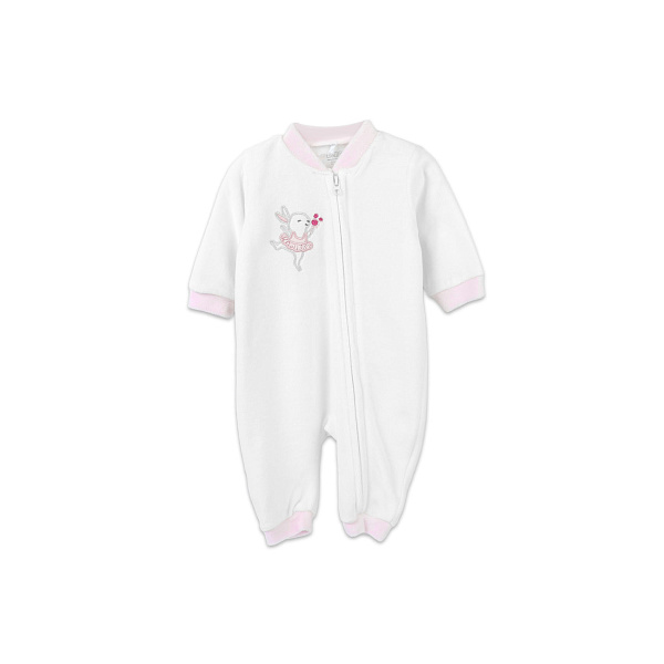 Велюровый комбинезон бережно согреет ребенка и подарит ему тепло, как объятия мамы. Пятка комбинезона открытая, штанины дополнены эластичными манжетами нежного розового цвета. Рукава комбинезона длинные и также дополнены контрастными манжетами. По центру имеется косая застежка-молния, она упрощает процесс переодевания малыша. небольшой воротничок на горловине защитит шею ребенка от ветра и прохлады. Завершает дизайн забавный принт на грудной части с изображением кролика-балерины. В основе ткани использован натуральный хлопок и полиэстер, комбинация нитей обеспечивает естественный обмен воздуха, бережно сохраняет тепло и дарит комфорт телу. Рекомендовано для детей ясельного возраста.