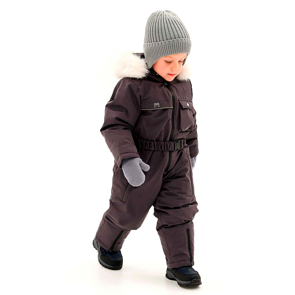 Зимний комбинезон для мальчка выполнен в красивом темно-сером цвете. Особый акцент — пушистая опушка из искусственного меха на капюшоне. Модель с эластичным поясом отлично держит форму, обеспечивая комфорт во время активных прогулок. Передняя застежка на молнии с ветрозащитной планкой препятствует проникновению холода.