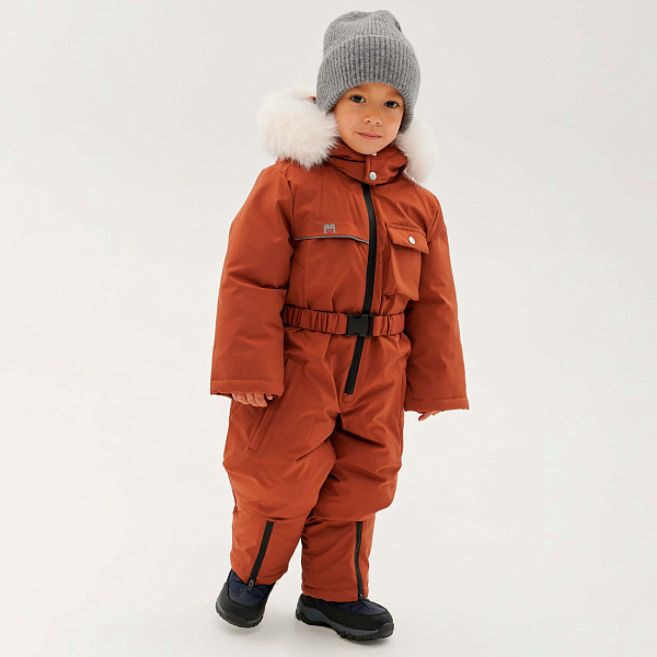 Зимний комбинезон для мальчика выполнен в красивом коричневом цвете. Особый акцент — пушистая опушка из искусственного меха на капюшоне. Модель с эластичным поясом отлично держит форму, обеспечивая комфорт во время активных прогулок. Передняя застежка на молнии с ветрозащитной планкой препятствует проникновению холода.