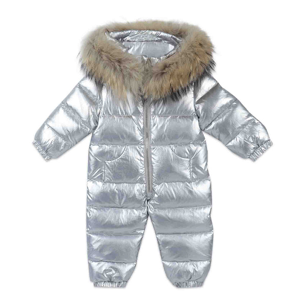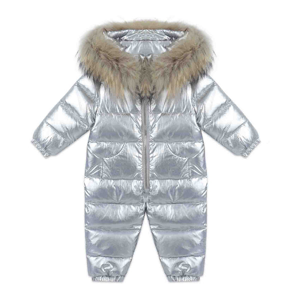 Комбинезон Lanson Kids зимний с капюшоном и меховой опушкой на молнии серебряный