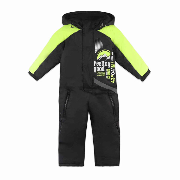 Зимний комбинезон для мальчика подходит для суровых зимних условий. Основной черный цвет разбавляется ярким зелеными элементами на рукавах. Комбинезон изготовлен из прочного полиэстера, который устойчив к износу и не пропускает влагу, что делает его отличным выбором для снежных дней. Резинка с фиксатором на капюшоне надежно защищает от ветра.