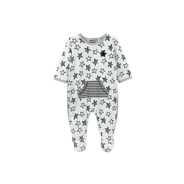 Трикотажный «звездный» комбинезон предназначен специально для будущих покорителей мира. Пошитый из натурального хлопка, он мягкий и хорошо пропускает воздух, обеспечивая сухость и комфорт в процессе носки. Ступни комбинезона закрыты и дополнены резинкой, она плотно обхватывает ножку, не позволяя штанине сползать, но и не сдавливает кожу. Длинные рукава дополнительно утеплят малыша. Вырез горловины круглый, воротника нет. Комбинезон выполнен в оригинальном стиле: передняя сторона усеяна множеством звезд, а задняя – черно-белыми полосами. Застежка расположена на задней стороне, ряд кнопок пролегает от ворота до низа штанин, облегчая переодевание. Передняя сторона украшена декоративным двухсторонним карманом. Рекомендовано для детей ясельного возраста.