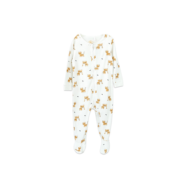 Ткань с изображением стилизованных тигрят понравятся малышам и сделают процедуру одевания забавной и увлекательной. Рукава комбинезона оформлены аккуратными манжетами, а горловина обработана бейкой, поэтому наряд безопасен для детского использования.