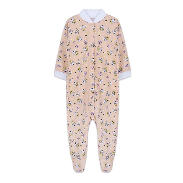 Универсальный комбинезон выполнен в нежном персиковом цвете с ярким и милым принтом с изображением забавных коровок и морковок, что придаёт изделию веселый и привлекательный внешний вид. Модель оснащена длинными рукавами и закрытыми ступнями. Застёжка на кнопках по всей длине изделия позволяет легко и быстро застегнуть и расстегнуть комбинезон.