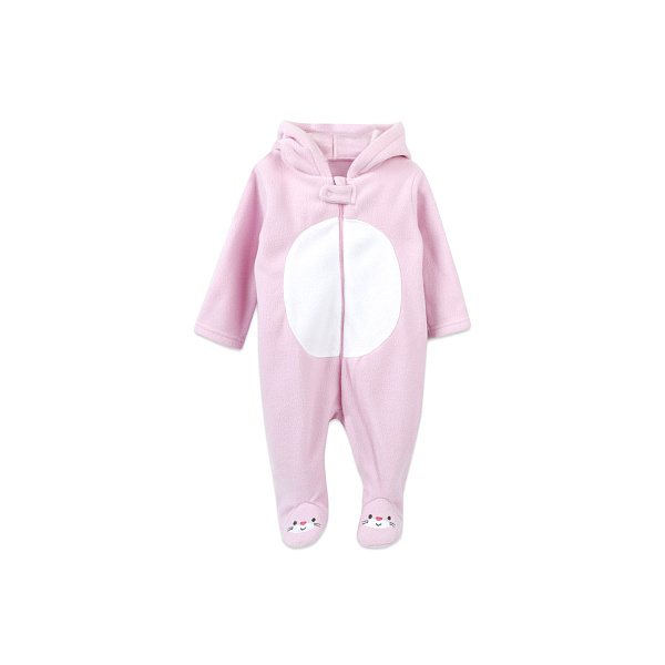 Нарядить малыша в маленького кролика можно не только с помощью нарядного костюма, но и благодаря мягкому комбинезону. Мягкая и приятная на ощупь ткань хорошо пропускает воздух и сохраняет тепло. Комбинезон закрытый, розового цвета. Ступни закрытые и украшены мордочками кроликов, рукава длинные и свободные. Фасон не сковывает движения и дарит комфорт в процессе носки. Глубокий капюшон украшен ушками и мордочкой зайца. Застежка-молния расположена по центру от выреза горловины до ступни, с ее помощью легко переодеть малыша и сменить подгузник. Завершает образ застежка-кнопка под воротом. Рекомендовано для детей ясельного возраста.