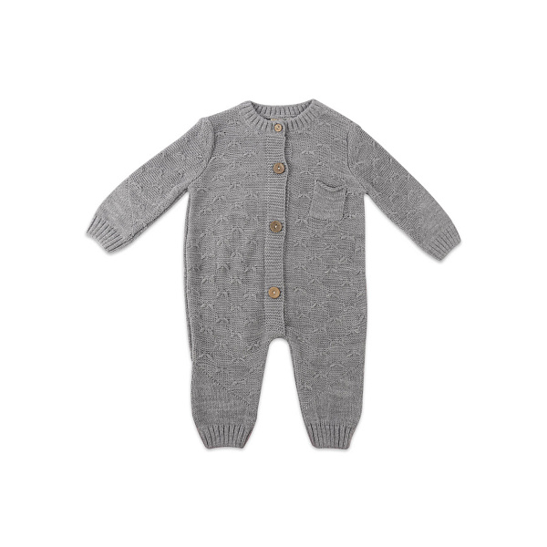 Изделие декорировано небольшим карманом. Основная его часть создана с использованием технологии производственной вязки гладью. У вещи есть комфортные элементы фиксации в виде пуговиц. На горловине, внизу рук и ног ребенка расположены манжеты.