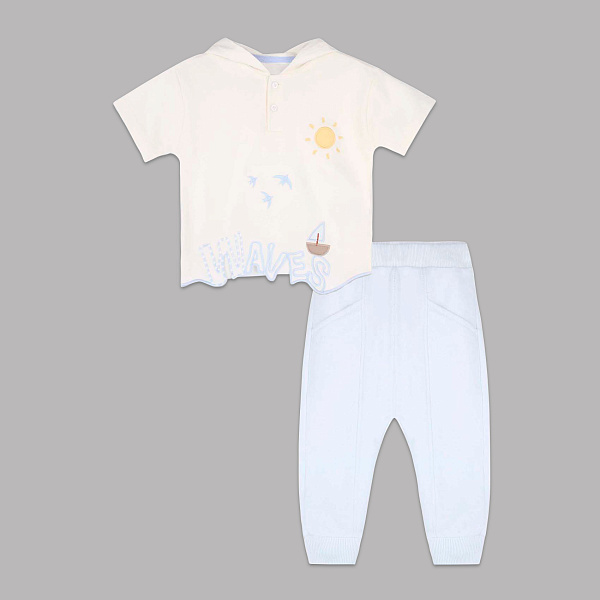 Комплект для малышей, выполненный из 100% хлопка, сочетает в себе стиль и комфорт. Этот комплект состоит из двух частей: футболки с коротким рукавом и капюшоном, а также удобных штанишек.