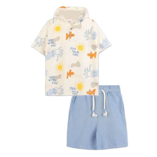 Комплект Bebetto футболка с капюшоном и шорты принт пальмы под солнцем бело-голубой